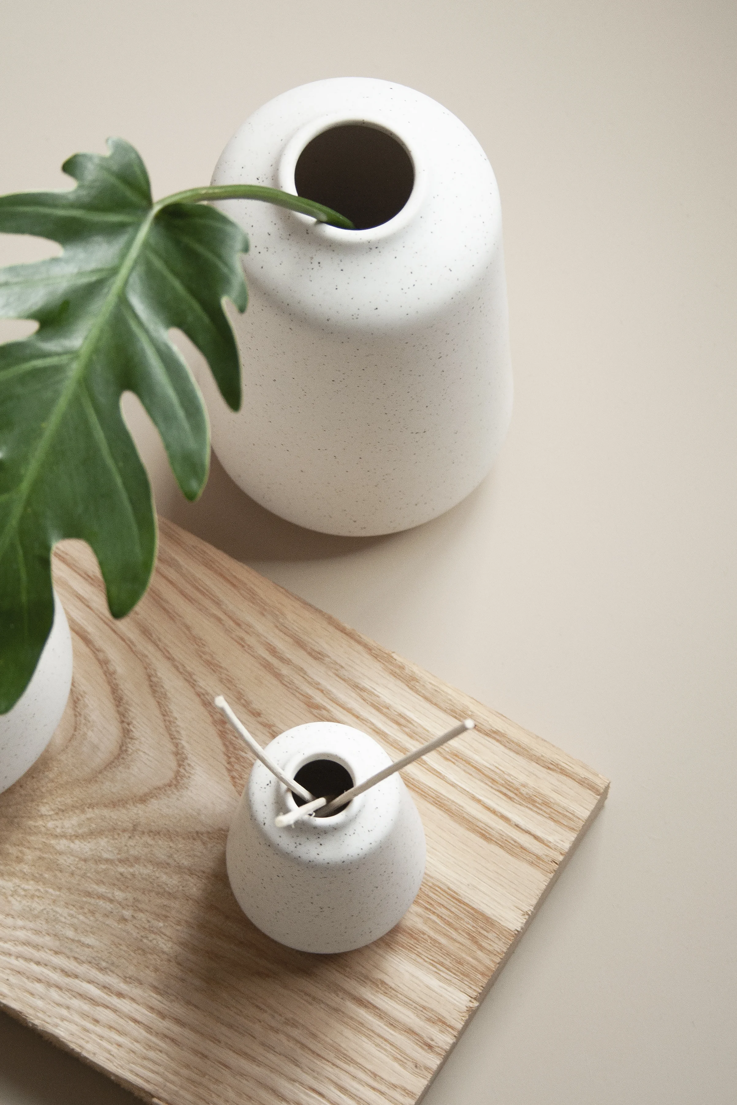 La colección consta de 4 piezas diferentes. Su esmalte blanco moteado aplicado a mano, hacen de cada pieza única y con una característica audaz al tacto.
